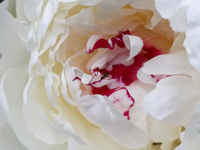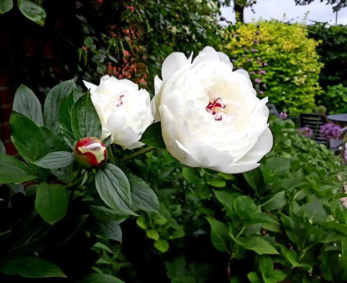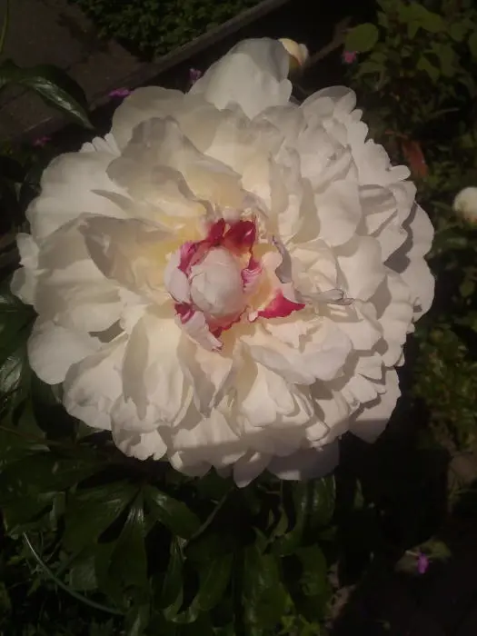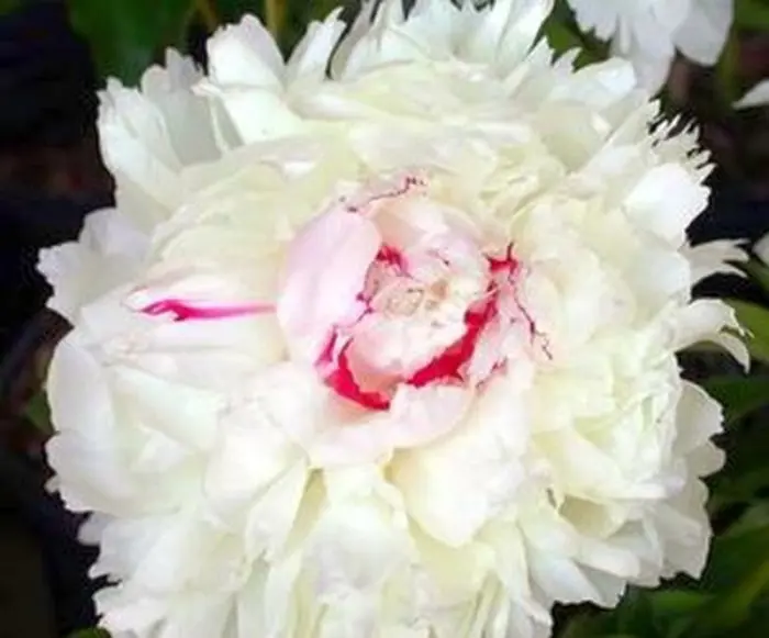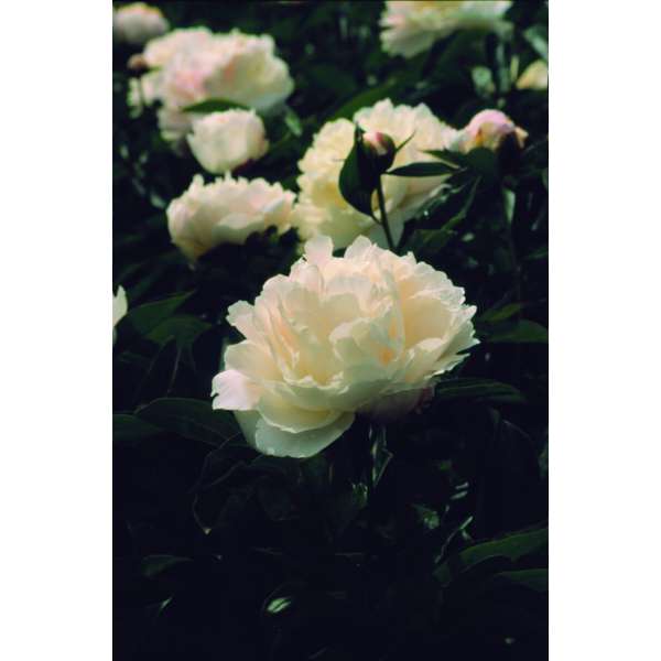 Eine krautige weiße Pfingstrose mit doppelten Blüten von 80 cm Höhe.