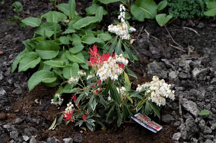 Pieris 'Flaming Silver' ist ein Strauch mit wunderschönen hängenden Clustern von cremeweißen, urnenartigen Blüten im Frühling, die süß nach Honig duften.