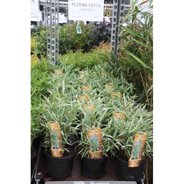 Pleioblastus fortunei bildet einen dichten Büschel weiß-variegierter Blätter.