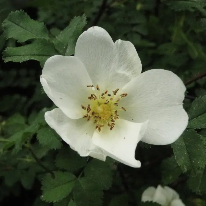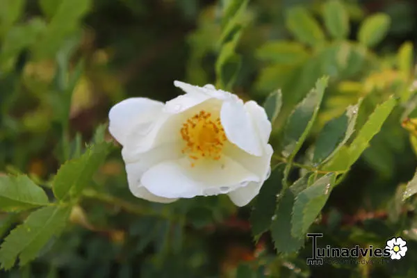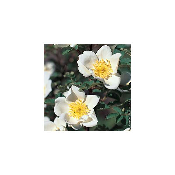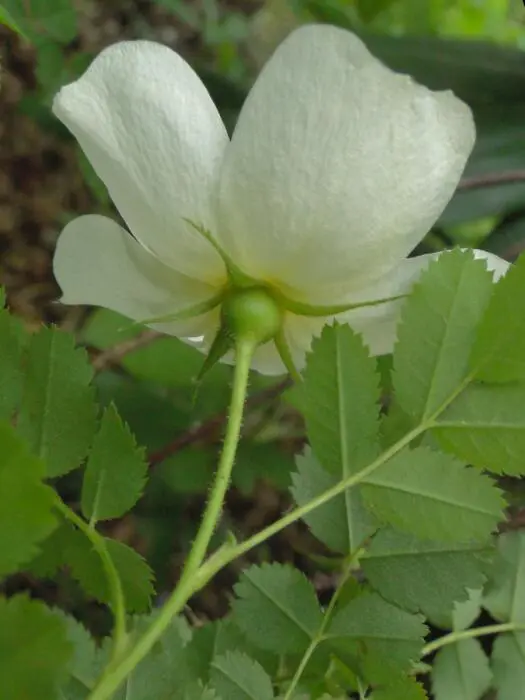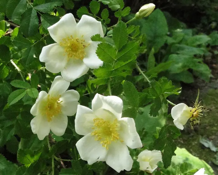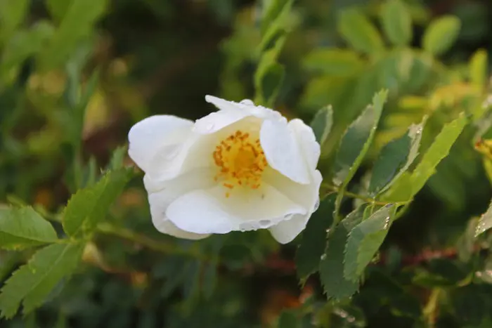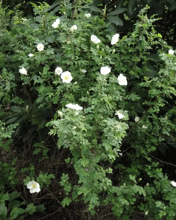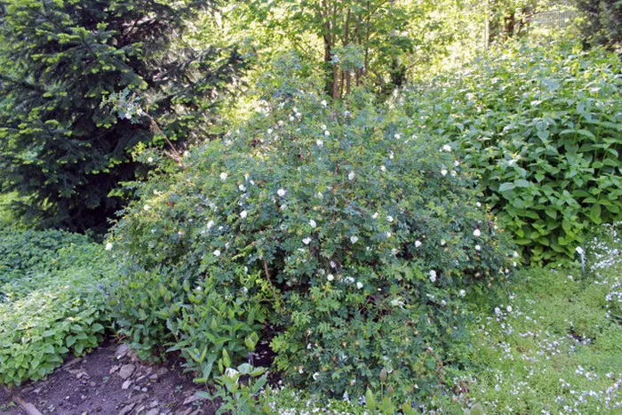 Die Rosen sind cremeweiß, manchmal mit einem rosa Schimmer, gefolgt von kleinen schwarzen Hüften.