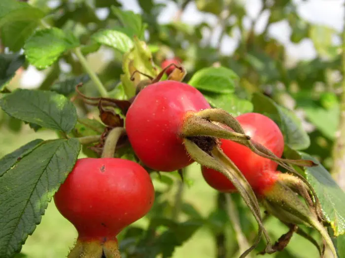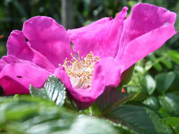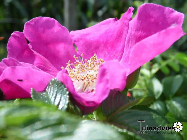 Ideal für eine Hecke: Sie sind dichte, dornige Sträucher mit duftenden einzelnen violett-roten Blüten und auffälligen gelben Staubblättern, die den ganzen Sommer bis Ende August blühen, und danach bekommt man die glänzenden roten Hüften, die eher wie kleine Äpfel aussehen.