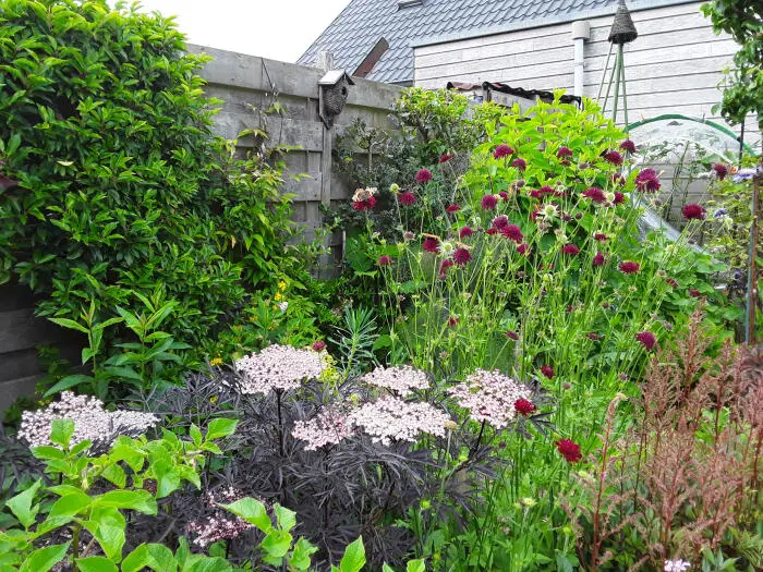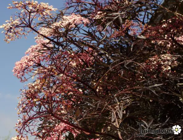 Sambucus 'Black Lace' ist ein dunkelblättriger Strauch mit violett-schwarzen Blättern und weiß-rosa Dolden.