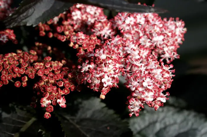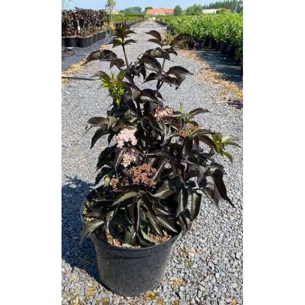 Sambucus nigra 'Black Tower' hat ein säulenförmiges Wachstum mit dunkelvioletten Blättern und großen violett-rosa Blüten.