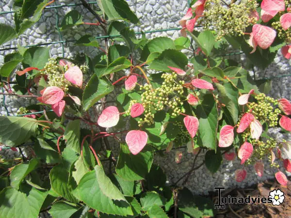Schizophragma hydrangeoides var. Hydrangeides 'Roseum' ist eine selbstklebende Kletterpflanze.