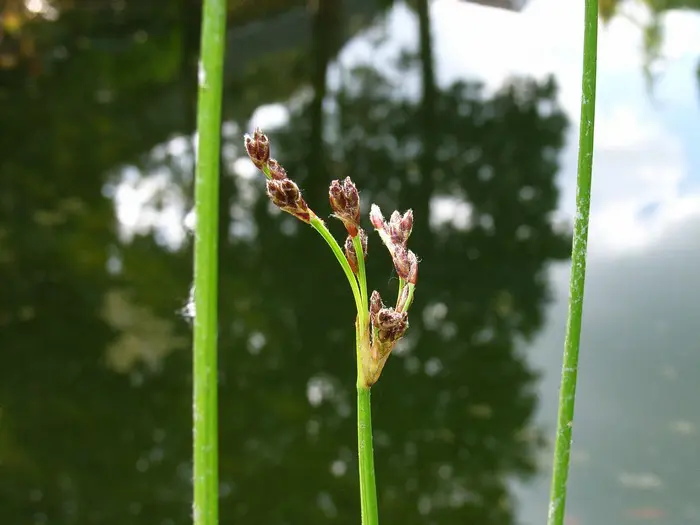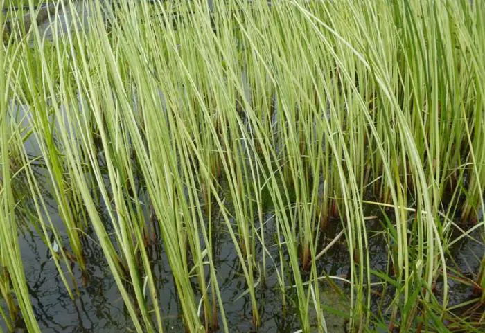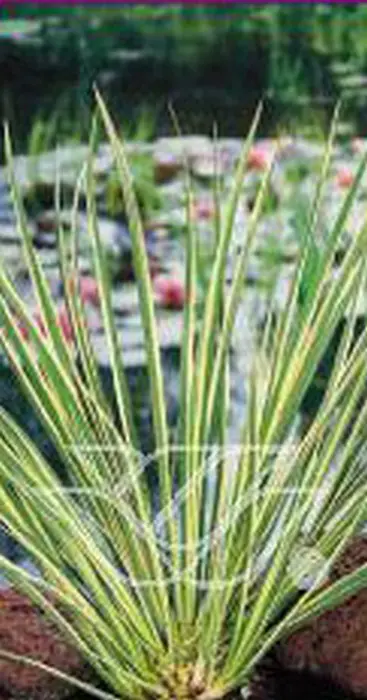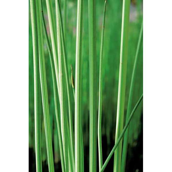 Scirpus lacustris 'Albescens' hat steife, gerade gestreifte, grün-weiß gestreifte Stängel.