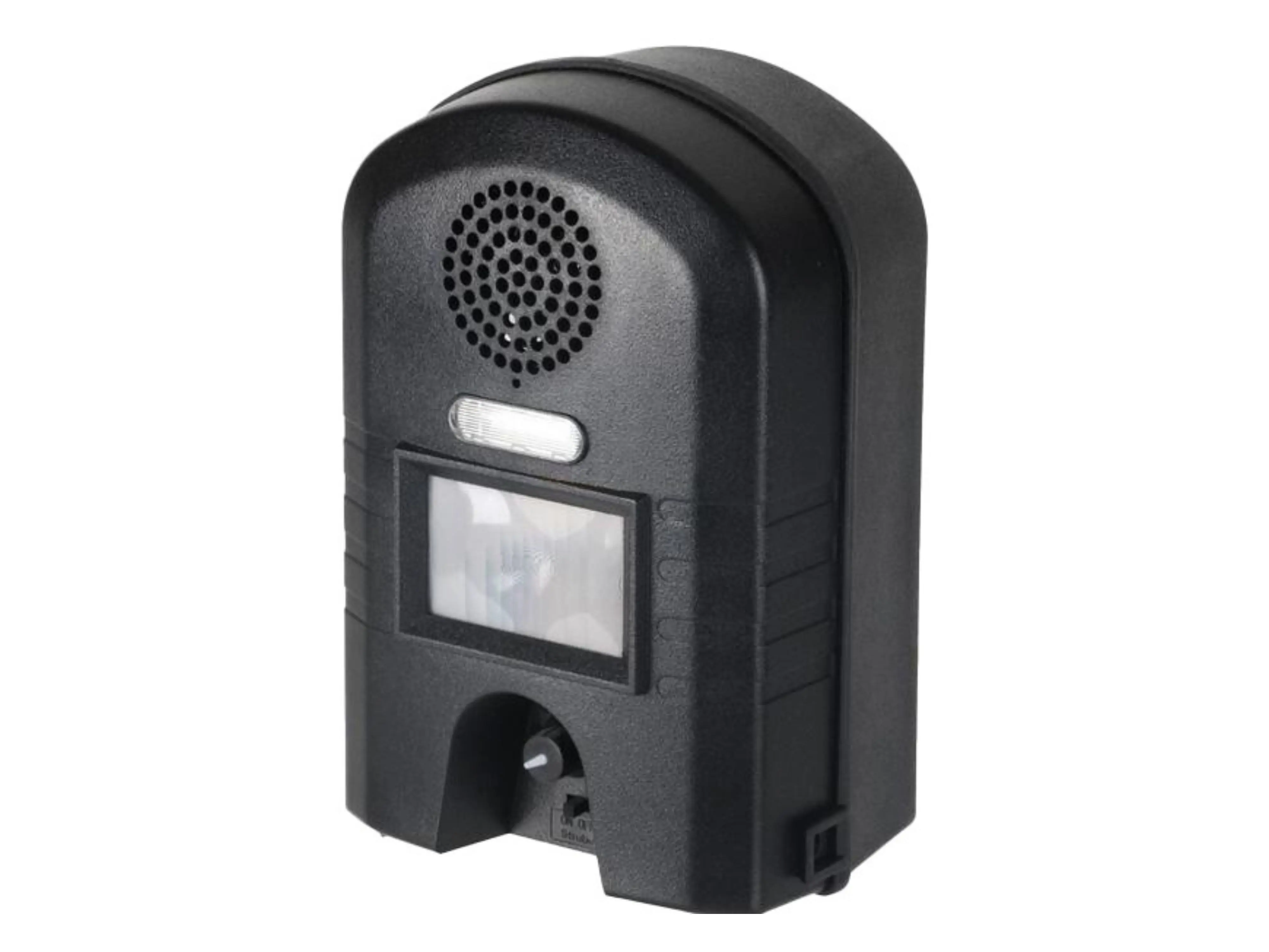 Das Gerät ist mit einem Infrarot-Bewegungsmelder ausgestattet, der reagiert, wenn ein Tier vorbeigeht. Das Gerät sendet hochfrequente Geräusche (Ultraschallgeräusche), die für Menschen kaum oder unhörbar sind, aber für bestimmte Tiere sehr hörbar. Gleichzeitig flackert der Blitz auf, was dazu beiträgt, das Tier zu vertreiben. Diese Taschenlampe kann über den Knopf am unteren Rand des Geräts aktiviert oder deaktiviert werden (AUS).