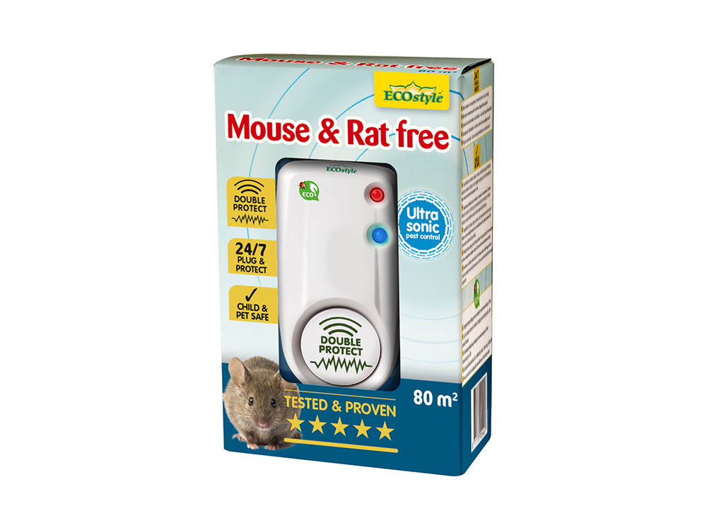 Die Maus und Ratte frei von Ecostyle ist ein leistungsstarker Ultraschallabwehrer, der sich zur Schädlingsbekämpfung in einem Raum eignet! Die Double Protect-Funktion kombiniert Single Protect und Elektropuls. Er bietet doppelten Schutz gegen Mäuse und Ratten.