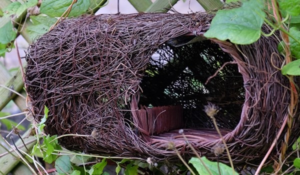Dieser einzigartige Nistbeutel wurde in Zusammenarbeit mit Simon King, Naturforscher und Wildkameramann, entwickelt und nutzte sein jahrelanges Wissen. Rotkehlchen bevorzugen eine offene Nistkiste, die leicht zugänglich, aber dennoch vor Raubtieren verborgen ist. Der Eingang ist offen, aber der Nistplatz selbst ist hinter der Seitenwand verborgen und vom Dach abgedeckt. Der Boden des Beutels besteht aus Rattan mit einer niedrigen Trennwand zwischen Eingang und Nistplatz.
