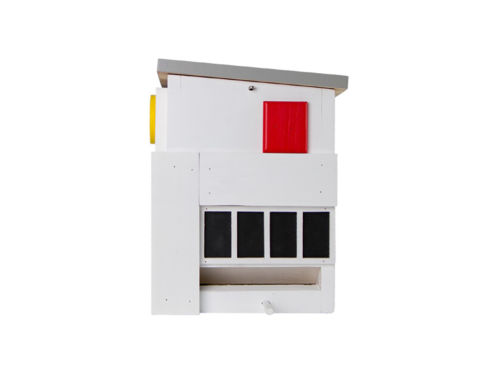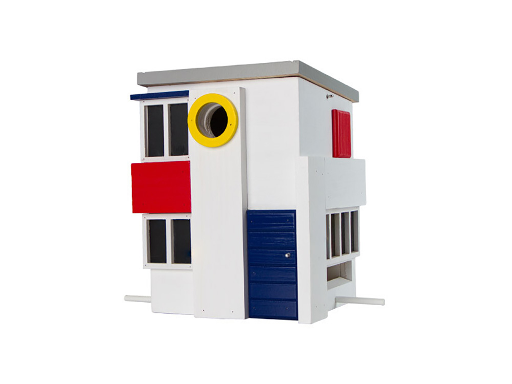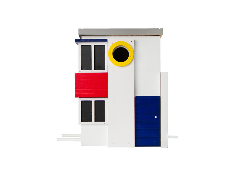 Diese moderne Vogelvilla kann je nach Jahreszeit als Nistkiste oder als Futterspender genutzt werden. Das Haus wurde nach der modernistischen Architektur von De Stijl entworfen, einer niederländischen Kunstbewegung, die Mondrian 1917 begründete. Die klaren Linien und geometrischen Formen in Kombination mit den drei Hauptfarben Rot, Blau und Gelb machen diese Villa zu einer schönen Ergänzung für den Garten.