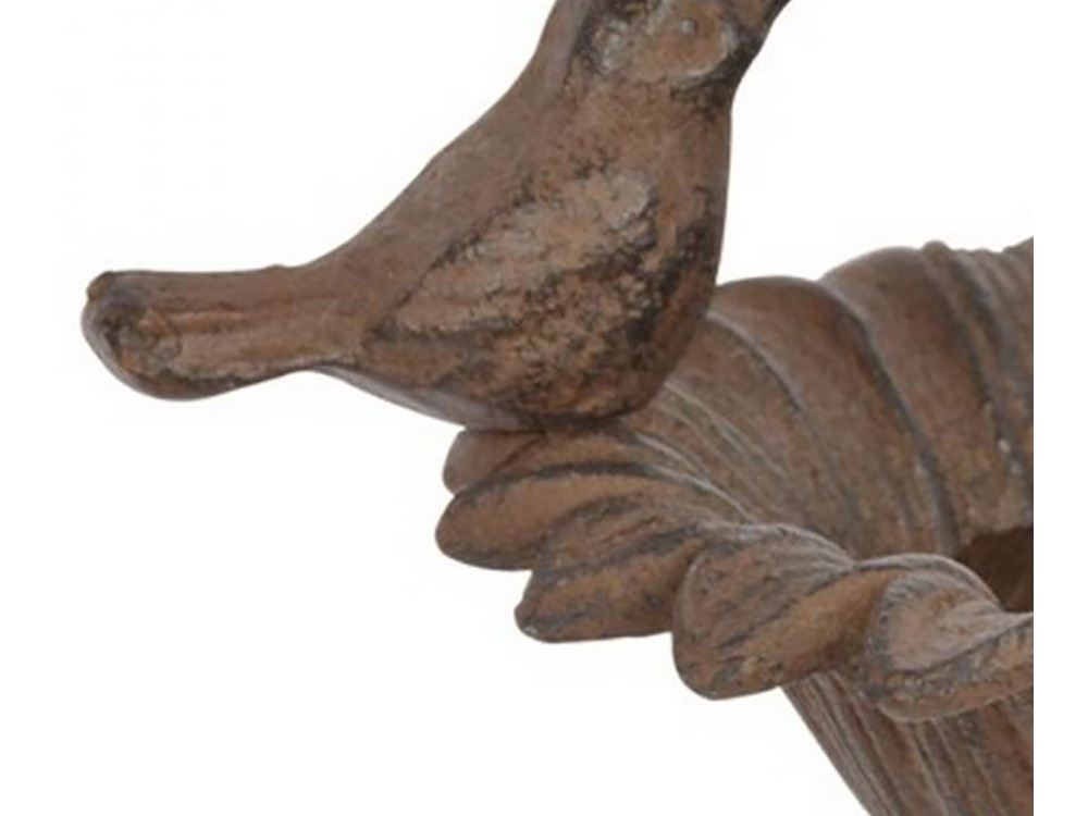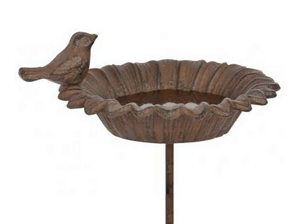 Am Rand dieser gusseisernen Sonnenblume ruht ein wunderschöner gusseiserner Vogel. Diese Blume auf Nadel von Esschert Design bietet den idealen Trink- und vielleicht Badeplatz für Ihre Gartenvögel in Ihrem Beet.