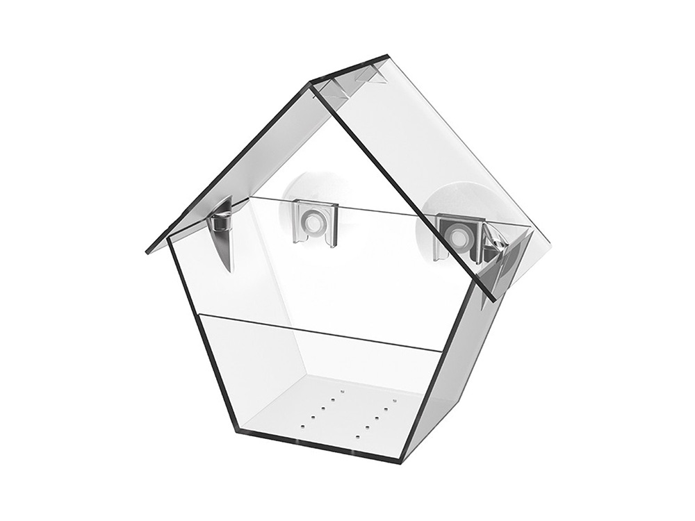 Das Fensterfutterhaus ist mit zwei Saugnäpfen ausgestattet und verfügt über einen perforierten Boden, um Regenwasser abzuleiten.