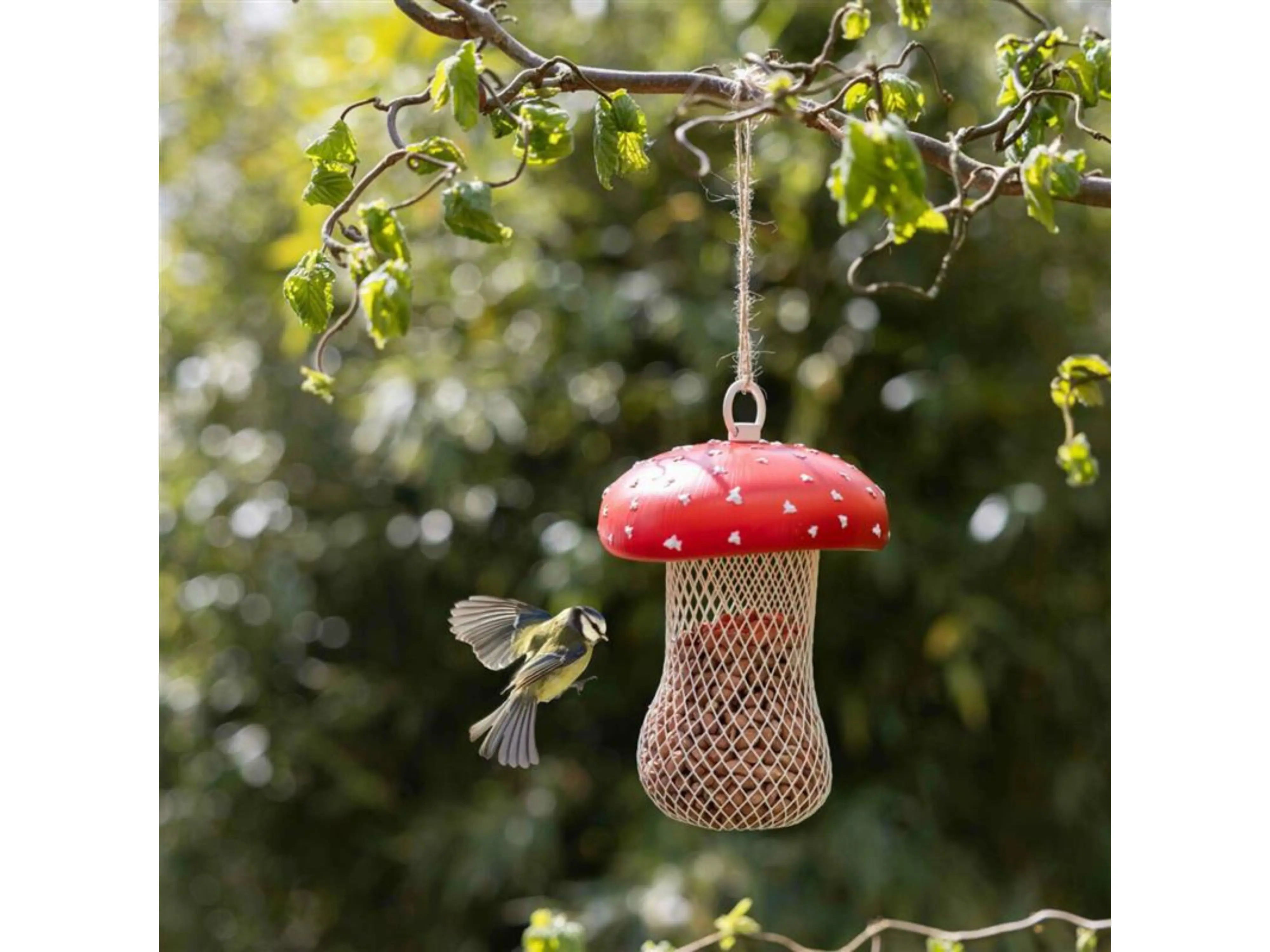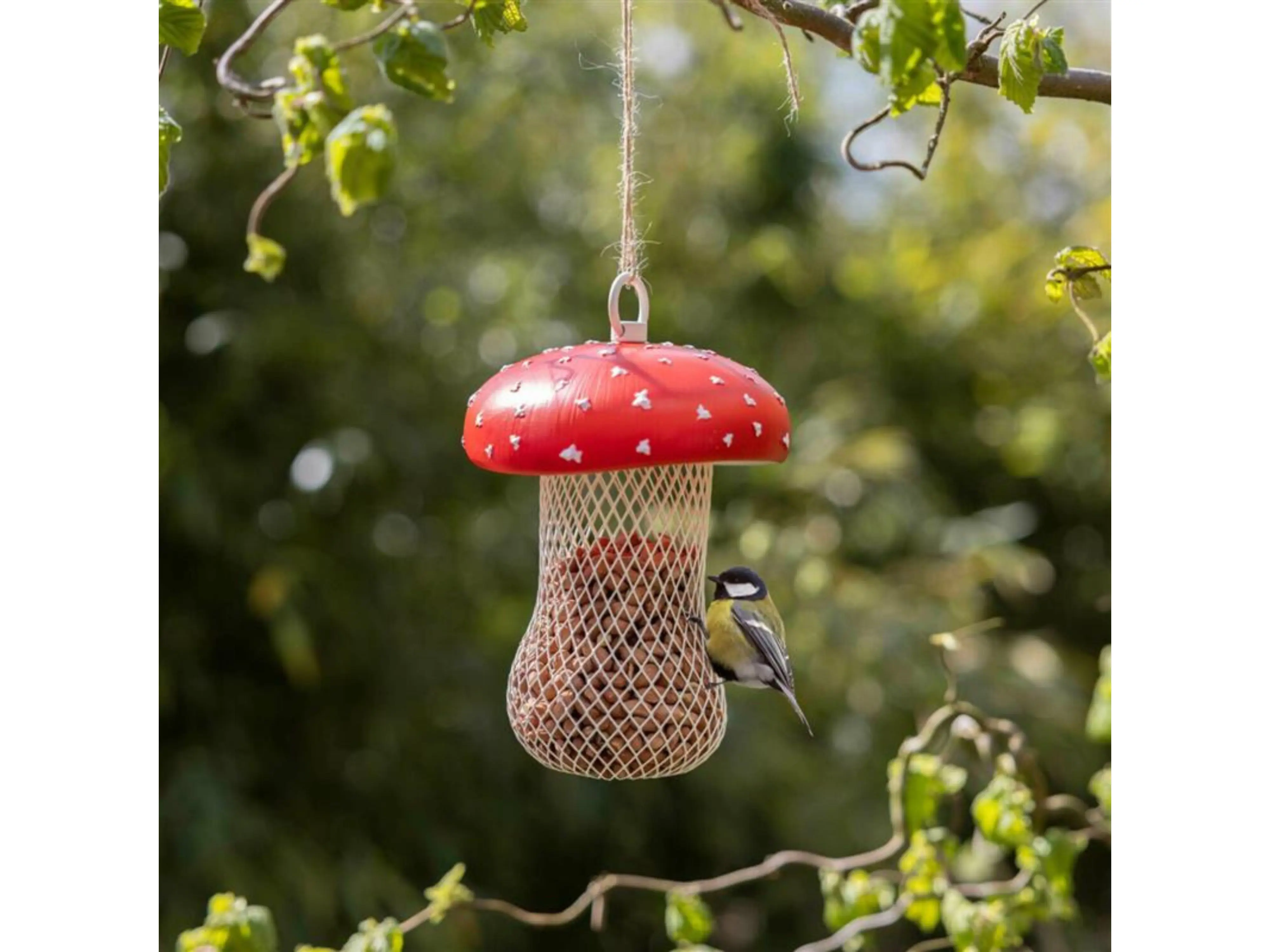 Bringen Sie Atmosphäre in Ihren Garten und helfen Sie den Vögeln mit diesem Futter-Silo in Form eines Fliegenpilz. Ein echter Blickfang, der nicht nur funktional, sondern auch eine fröhliche Ergänzung für Ihren Außenbereich ist. Ideal zum Füttern von Erdnüssen , Spechten, Kleibern und anderen Gartenvögeln.