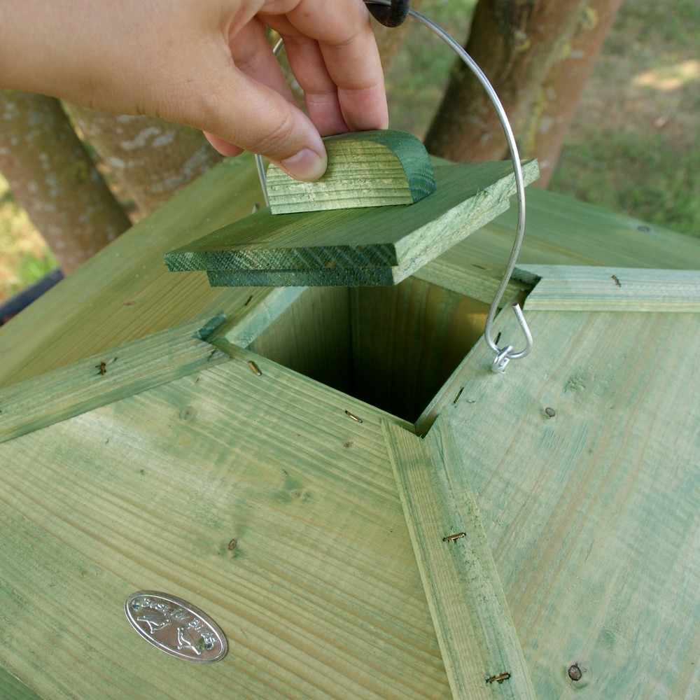 Lassen Sie die Vögel Ruhe und Schutz vor Samen, Erdnüssen oder Körnern genießen mit diesem großen Futterhaus in Ihrem Garten.