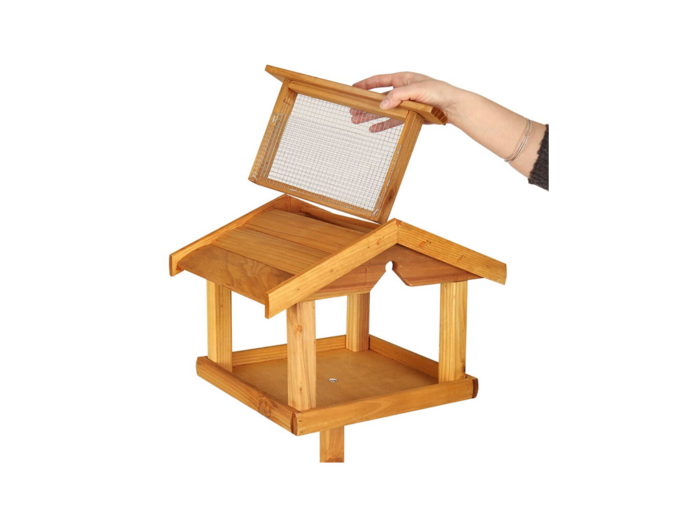 Dieser hölzerne Fütterungstisch auf einem Stativ passt in jeden Garten, ob groß oder klein. Dieser Futtertisch verfügt über ein praktisches, abnehmbares Futtersilo , das sich problemlos in das Deck hinein- und herausschieben lässt. Dieses Silo kann für geschälte Erdnüsse oder Sonnenblumenkerne verwendet werden und lässt sich leicht wieder auffüllen.
