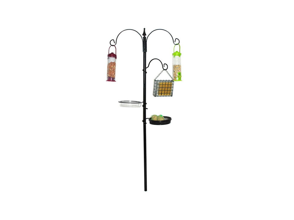 Diese Futterstation besteht aus einem festen doppelten Futterhaken oben. Zusätzlich gibt es drei separate verstellbare Fütterungshaken, einen mit einem Futternapf und einen mit einem Trinknaps. Sowohl der enthaltene Fütterungs- als auch der Trinknapf sind abnehmbar. Die Station besteht aus drei ineinandergreifenden anthrazitbeschichteten Röhren, von denen eines einen Erdungspin besitzt.