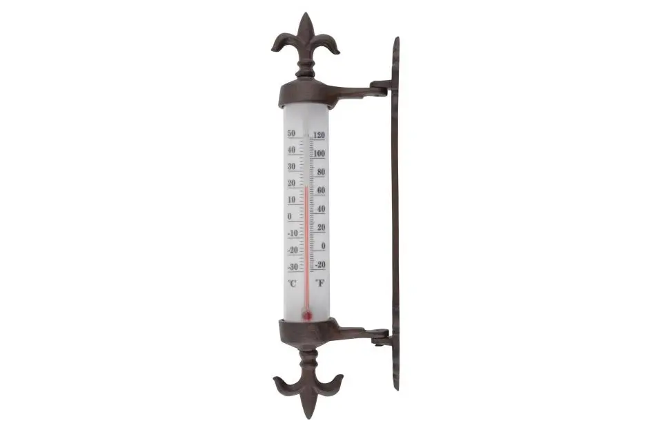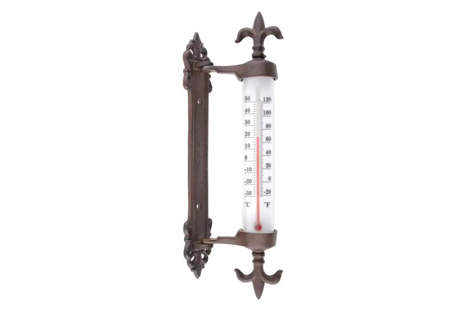 Das Thermometer, verziert mit einer hübschen Lilie, zeigt Temperaturen zwischen -30°C und +50°C an. Es besteht aus handgegossenem Gusseisen nach jahrhundertealter Handwerkskunst.