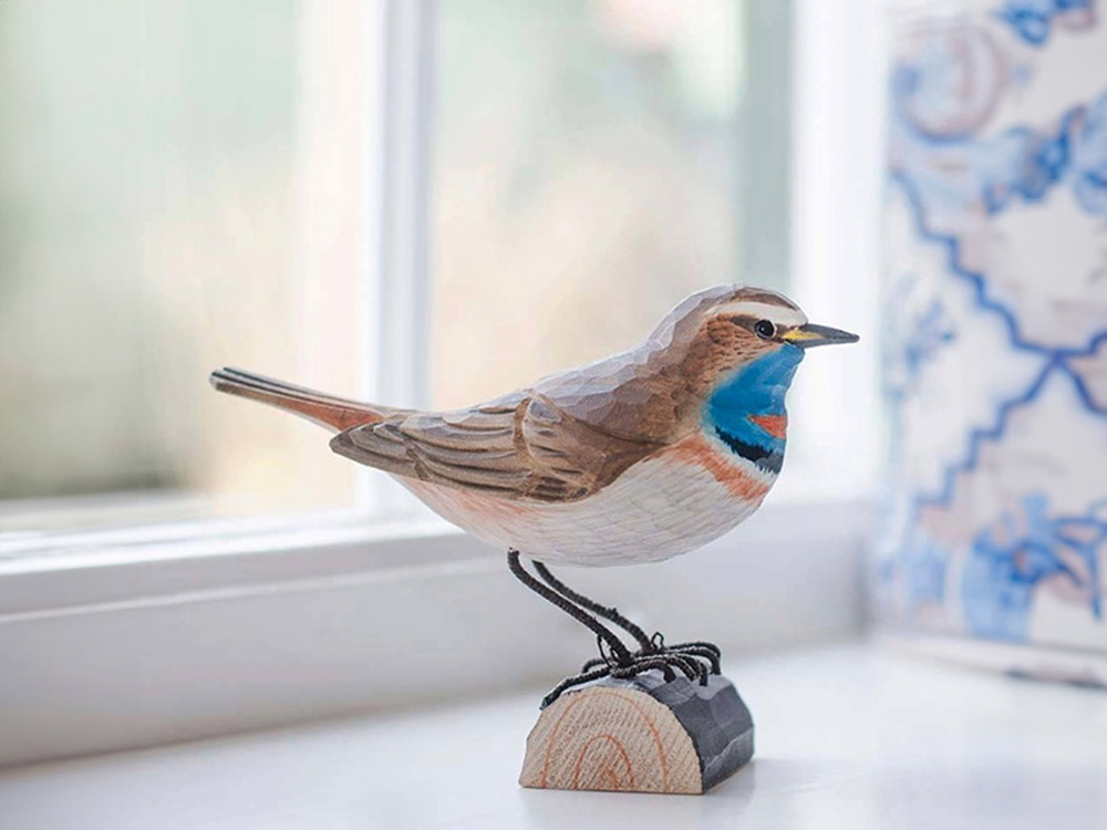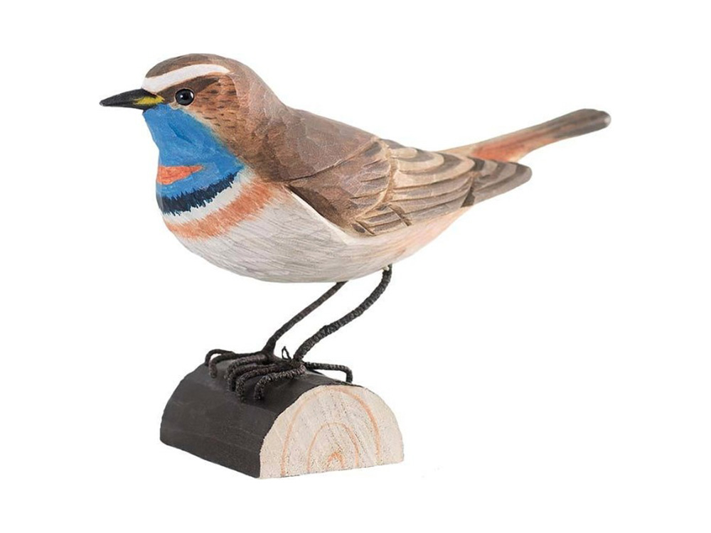 Der Kehlkehlvogel ist ein Zugvogel mit einer bemerkenswerten Stimme. Seine hellen, lebendigen Töne haben ihr sogar den Spitznamen 'Nordische Nachtigall' eingebracht. Dieser hölzerne Singvogel ist eine lebensechte Darstellung des männlichen Blaukehls. Die auffällige blaue Kehle mit ihrem rostroten Fleck ist das Hauptmerkmal dieses Vogels.