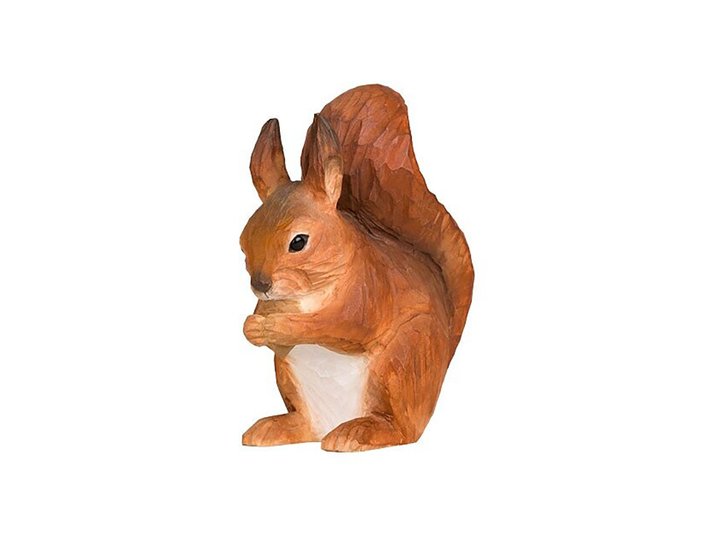Traditionell gestaltetes hölzernes Rothörnchen (Sciurus vulgaris). Diese Statue eines fressenden Eichhörnchens ist mit umweltfreundlicher Farbe bemalt.