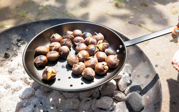 Mache einen Schnitt in die Kastanien und lege sie in die Pfanne. Schütteln Sie die Pfanne gelegentlich über den Flammen einer Feuerstelle oder eines Kamins, um die Kastanien gleichmäßig zu rösten.