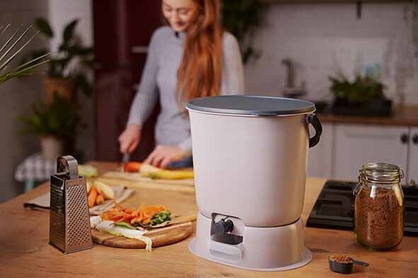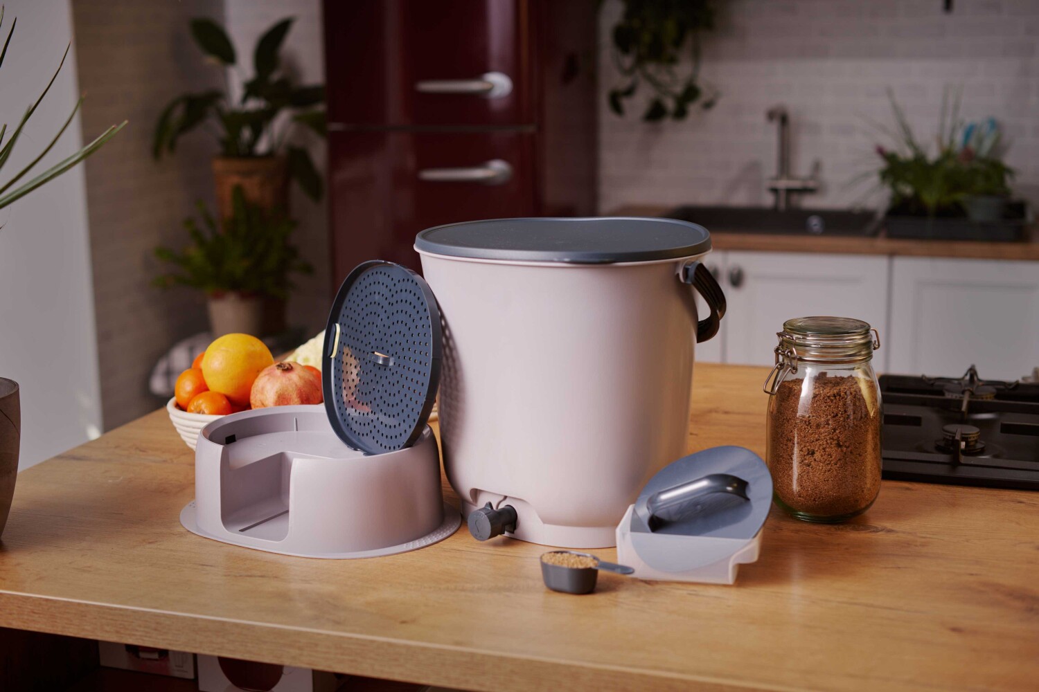 Bokashi Organko Essential ist ein funktional gestalteter Komposteimer für organische Abfälle. Man kann Küchenabfälle darin ohne Abfallbeutel sammeln und muss diesen Behälter nicht täglich leeren. Dieser kompakte Eimer passt perfekt unter die Küchentheke, in den Schrank oder in die Speisekammer.