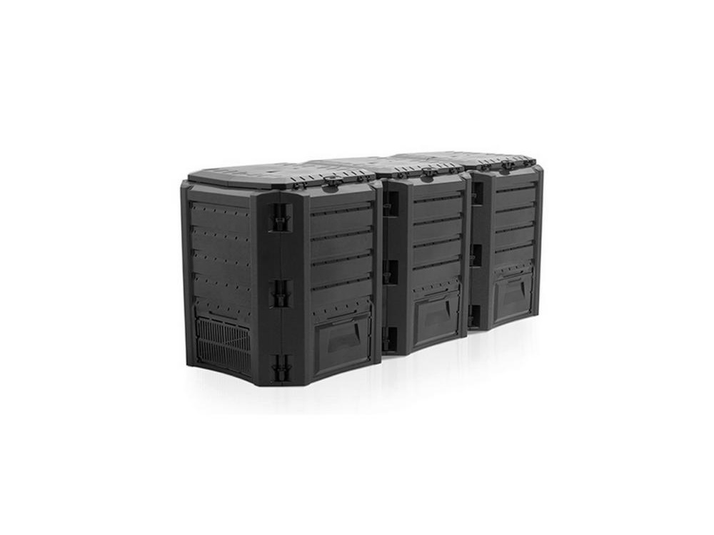 Dieses Kompostsystem besteht aus drei miteinander verbundenen Kompostbehältern , die eine große Kapazität von mindestens 1200 Litern verarbeiten können.