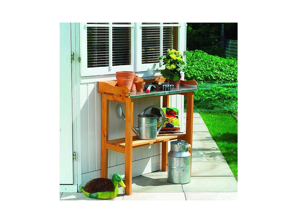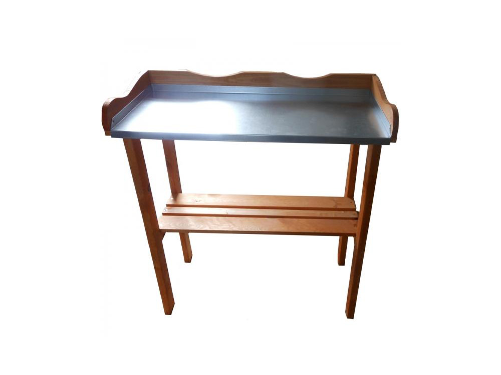 Holz-Blumentisch mit verzinkter Arbeitsplatte. Dieser robuste, praktische Topftisch besteht aus langlebigem, imprägniertem Kiefernholz. Das Holz hat eine honigbraune Farbe und ist sehr wetterfest.