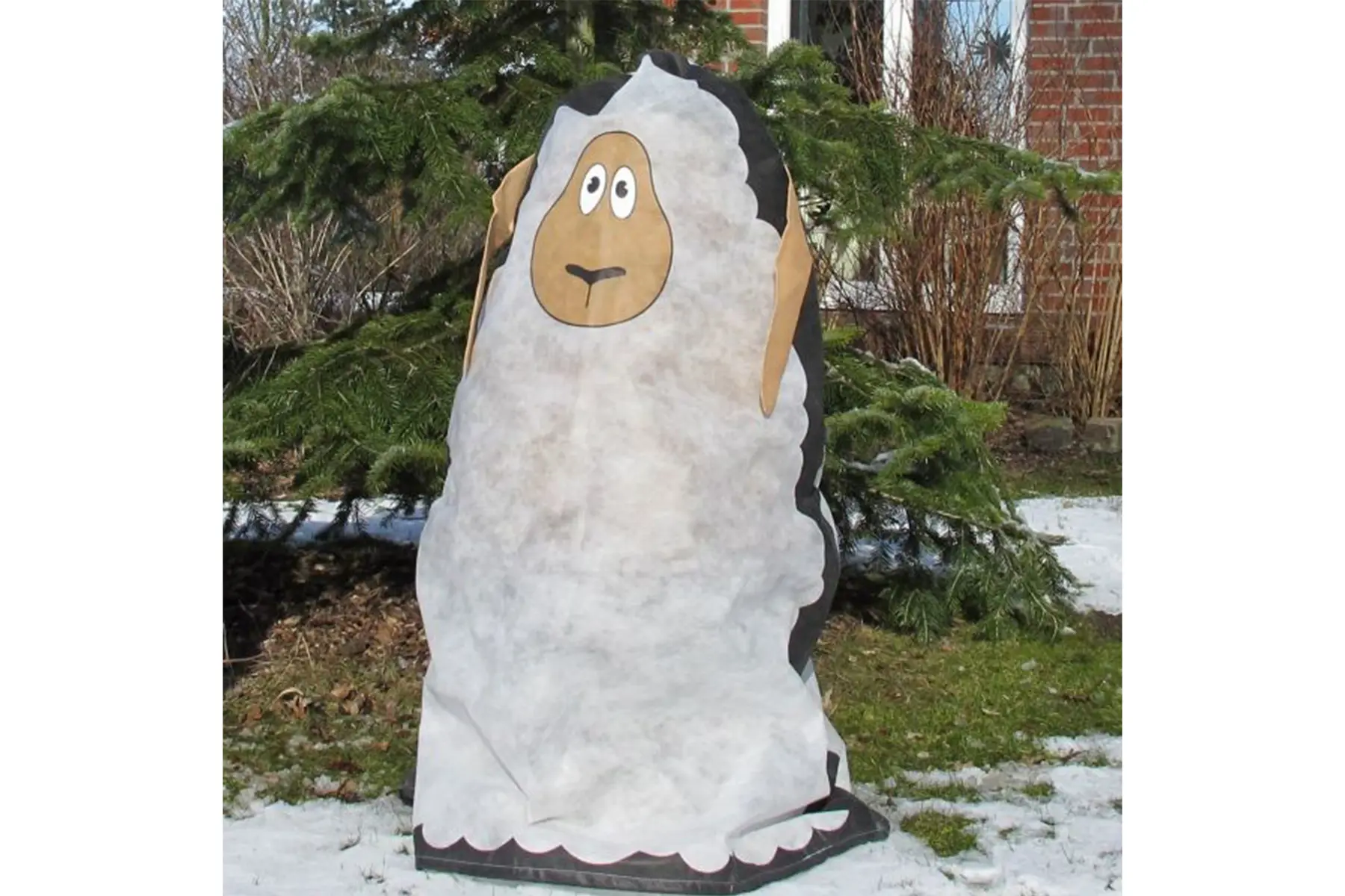 Eine dekorative Schutzhülle für Pflanzen in Form eines Schafs. Diese originale Pflanzenabdeckung schützt Ihre Pflanzen im Winter vor austrocknendem Wind, Frost und Schnee. Die Abdeckung ist wasser-, licht- und luftdurchlässig und besteht aus 50 g/m² Fleece.
