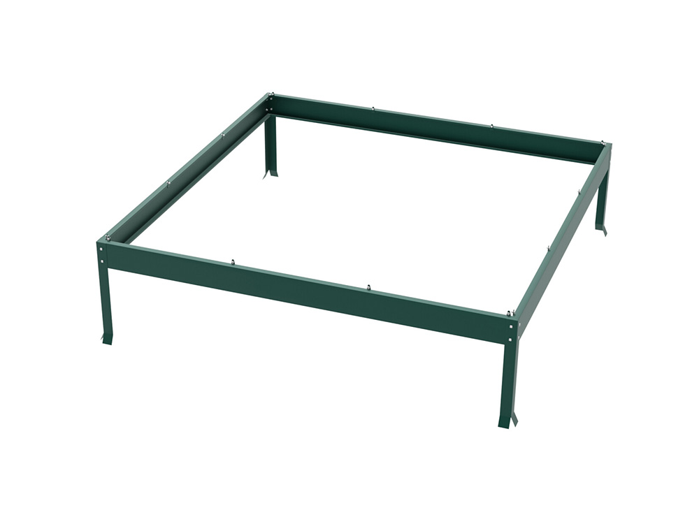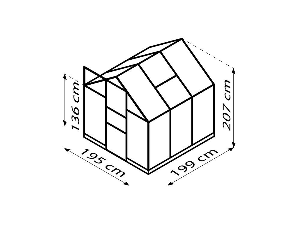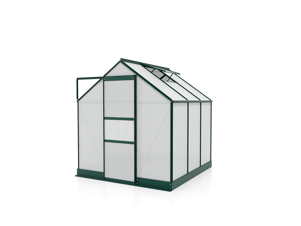 Der Rahmen besteht aus grünen, pulverbeschichteten Aluminiumprofilen. Die 61 cm breite Schiebetür kann so aufgehängt werden, dass sie sich nach links oder rechts öffnen lässt. Das Gewächshaus ist außerdem mit integrierten Dachrinnen und einem Fundament im Gewächshausrahmen ausgestattet. Das Fundament sorgt für eine solide und optimale Verbindung zwischen Rahmen und Fundament.