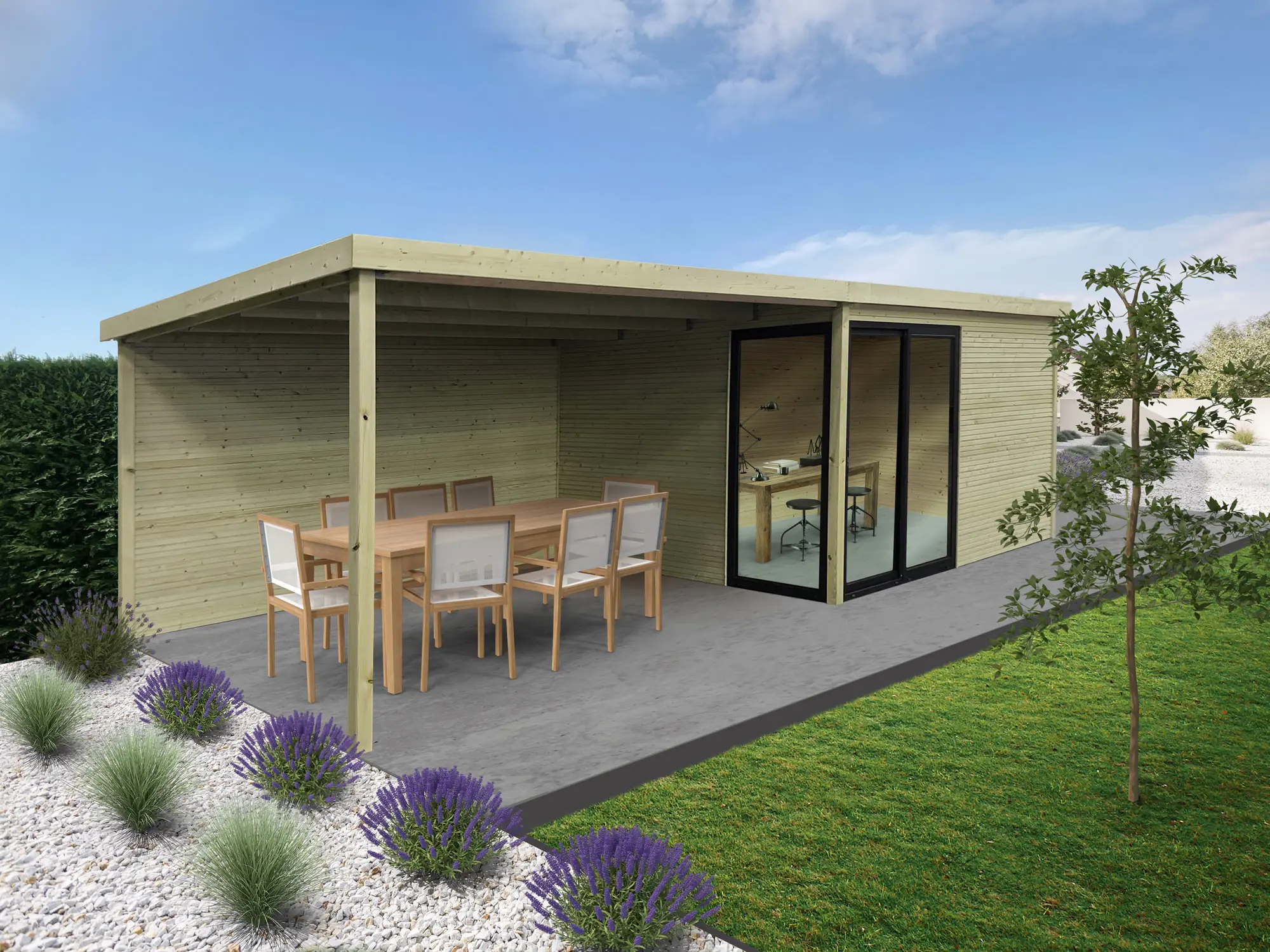 - Modernes Gartenhaus (404 x 304 cm) mit überdachter Terrasse (395 x 304 cm)