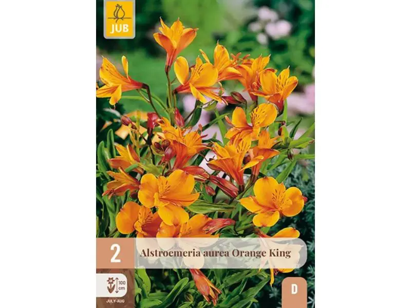 Alstroemeria aurea 'Orange King' ist eine auffällige, orange-gelbe blühende Staude , die eigentlich eine Knolle ist, aber hervorragend für den Beet. Die Pflanze erreicht eine Höhe von 90 bis 100 Zentimetern und bildet lange, bandförmige Blätter von mittel- bis dunkelgrünem Ton. Die Blüten sehen ein wenig aus wie Lilien und blühen von Juli bis August. Alstroemeria eignet sich ebenfalls sehr gut als Schnittblume.