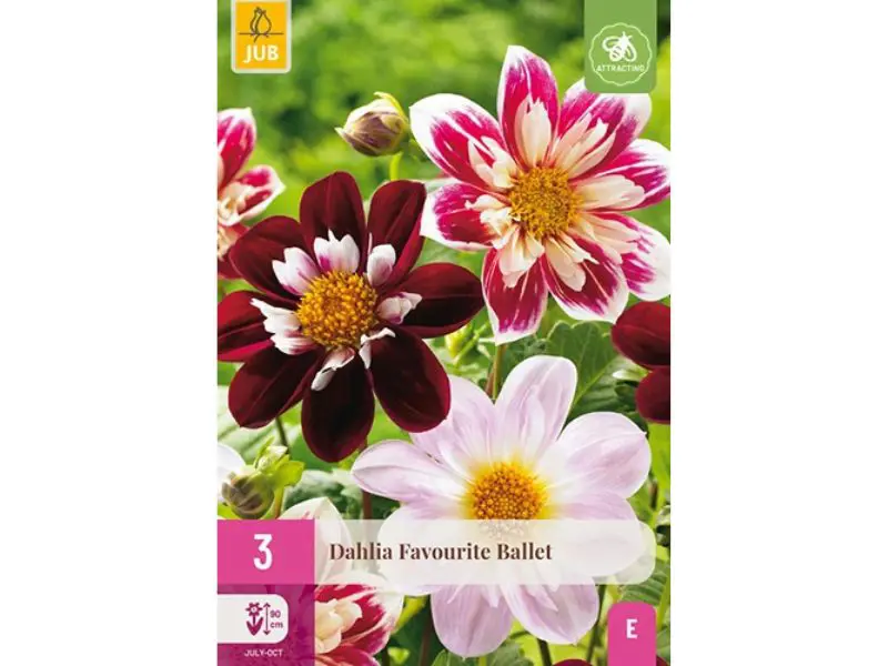 Die großblütige, dekorative Dahlienmischung 'Favourite Ballet' ist ein lohnender Sommerblüter, der Ihnen monatelang Freude bereitet. Dahlien blühen den ganzen Sommer über von Juli bis zum ersten Frost. Diese Dahlien werden etwa 50 cm groß. hoch. Manchmal ist es notwendig, die Blütenstängel zu stützen. Dahlienknollen können im Frühling gepflanzt werden. Dahlien reagieren empfindlich auf Frost, daher seien Sie vorsichtig bei nächtlichen Frösten. Grabe ein großes Pflanzloch, lockere die Erde und fülle das Pflanzloch mit guter Blumenerde. Setzen Sie die Knollen vorsichtig in das Pflanzloch und decken Sie sie mit 3–5 cm ab. Erde. Die Pflanzentfernung der Knollen beträgt 30–60 cm. Gib den Knollen nach dem Pflanzen sofort etwas Wasser. Dahlien blühen am üppigsten in voller Sonne. Bewahren Sie die Knollen nach der Blüte an einem frostfreien Ort auf, und Sie werden sie noch viele Jahre genießen. Dahlien lassen sich gut mit Stauden und anderen Dahliensorten kombinieren. Die Blumen sind echte Blickfanger im Beet. Dahlien sind ebenfalls ausgezeichnete Schnittblumen und haben eine lange Haltbarkeit in der Vase. Die beste Zeit, Dahlien zu schneiden, ist früh am Tag. Geben Sie die Stängel direkt in lauwarmes Wasser mit Schnittblumenfutter.
