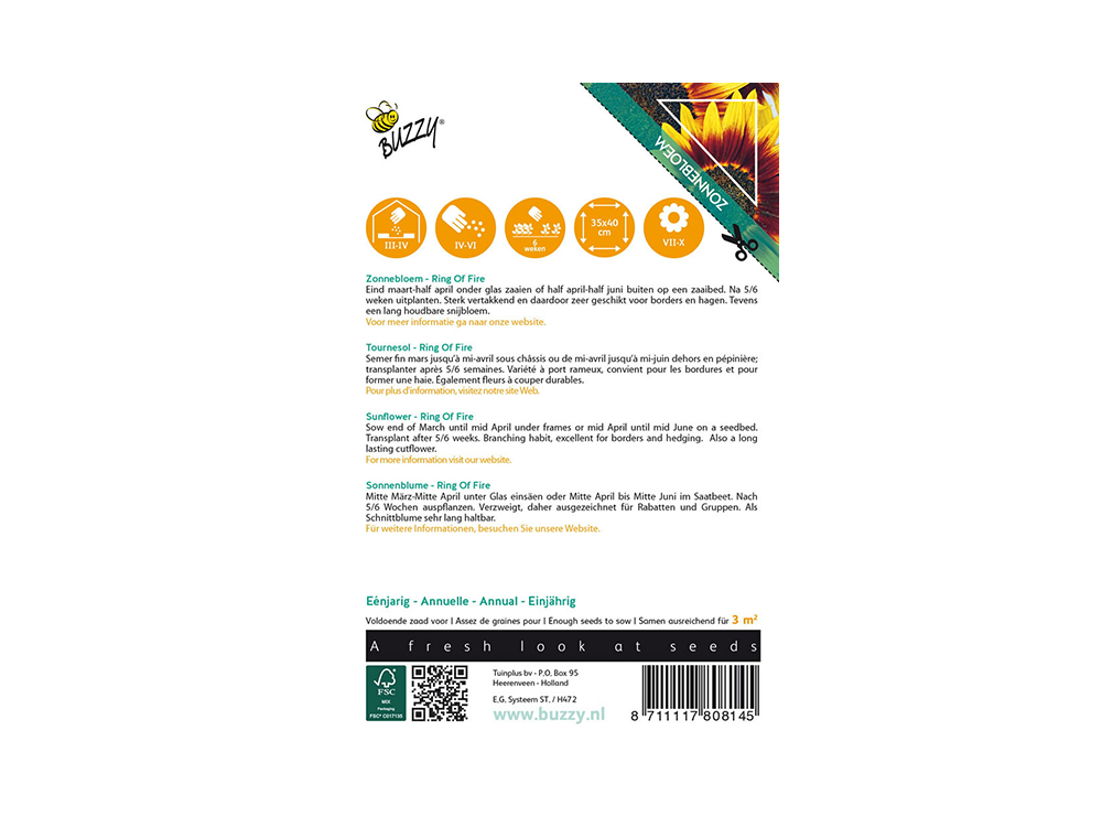 Sunflower Ring of Fire verzweigt stark, was diese Art sehr geeignet für Beete und Hecken macht. Sie ist außerdem eine langlebige Schnittblume. Leicht zu säen und sehr lange zu blühen.