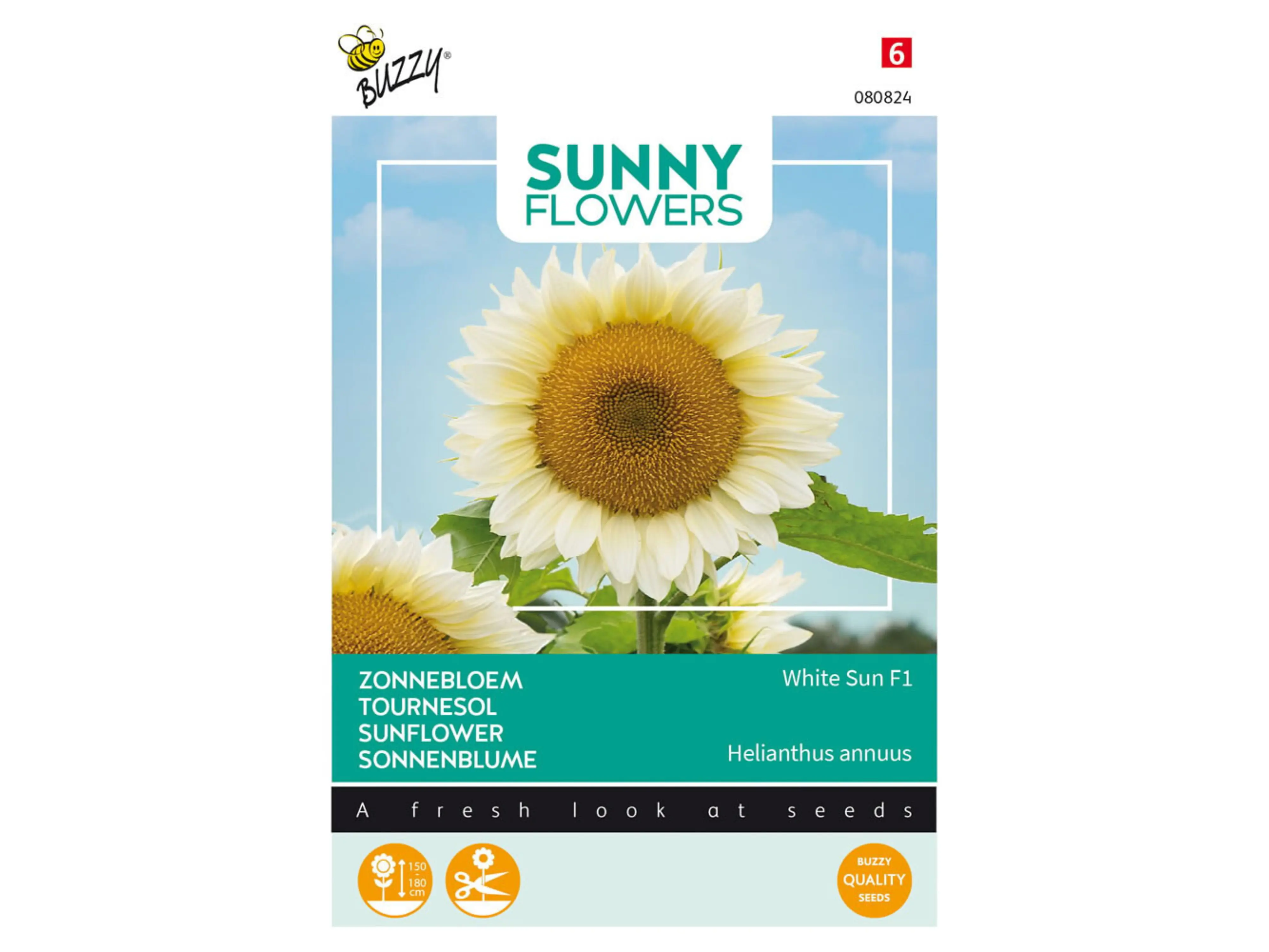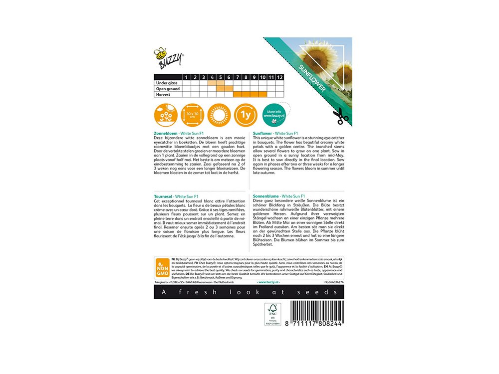 Sunflower White Sun F1 ist mit seinen cremeweißen Blütenblättern und dem wunderschönen goldenen Herzen ein echter Blickfang im Beet. Diese Blumen eignen sich auch hervorragend als Schnittblumen. Jede Pflanze bildet mehrere Blüten.
