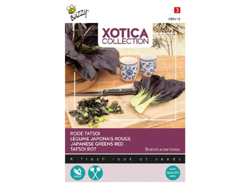 Tatsoi ist eine Variante des bekannten Pak Choi. Lila-rote Blätter mit einem köstlichen, starken, scharfen, fast knoblauchartigen Senfgeschmack.