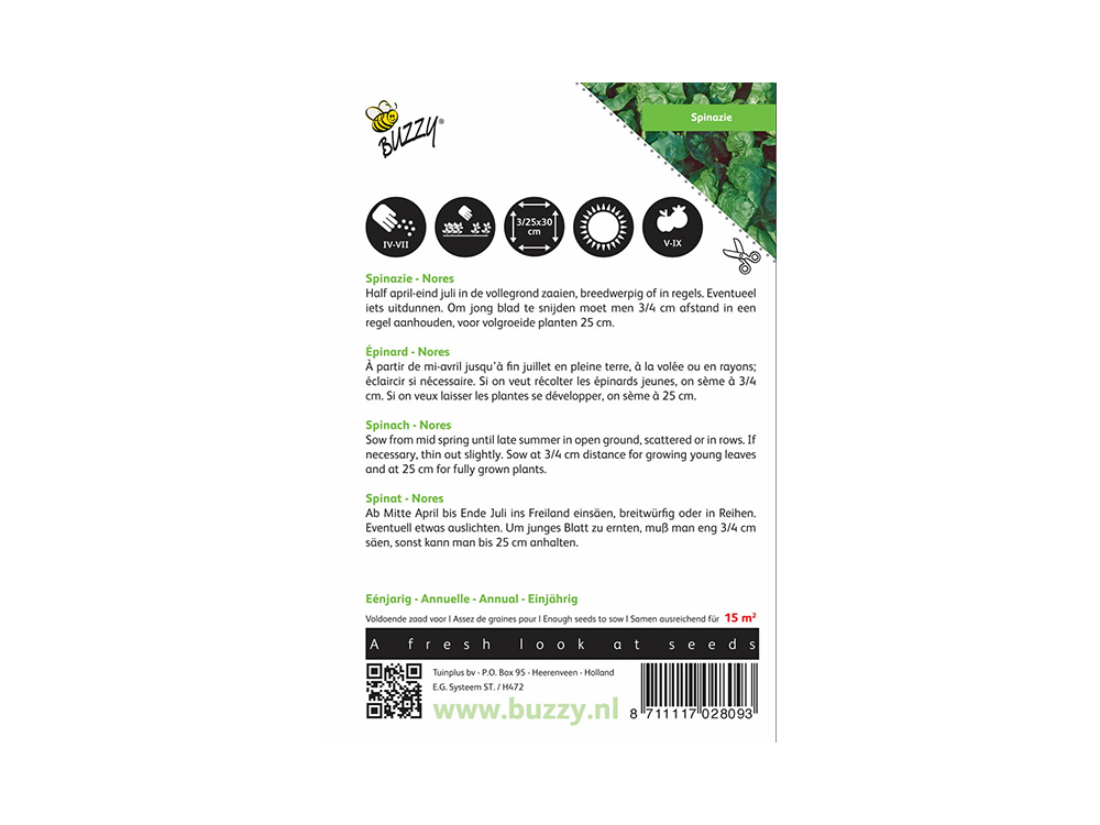 Spinat Nores wächst langsam und eignet sich daher für den Sommeranbau. Diese großblättrige, dunkelgrüne Sorte blüht nicht leicht. Die zarten Blätter schmecken ausgezeichnet. Die Rasse ist außerdem völlig resistent gegen die lästige Pilzkrankheit Wolf (Physio A und B). Samen Aussäen von Spinatnores: