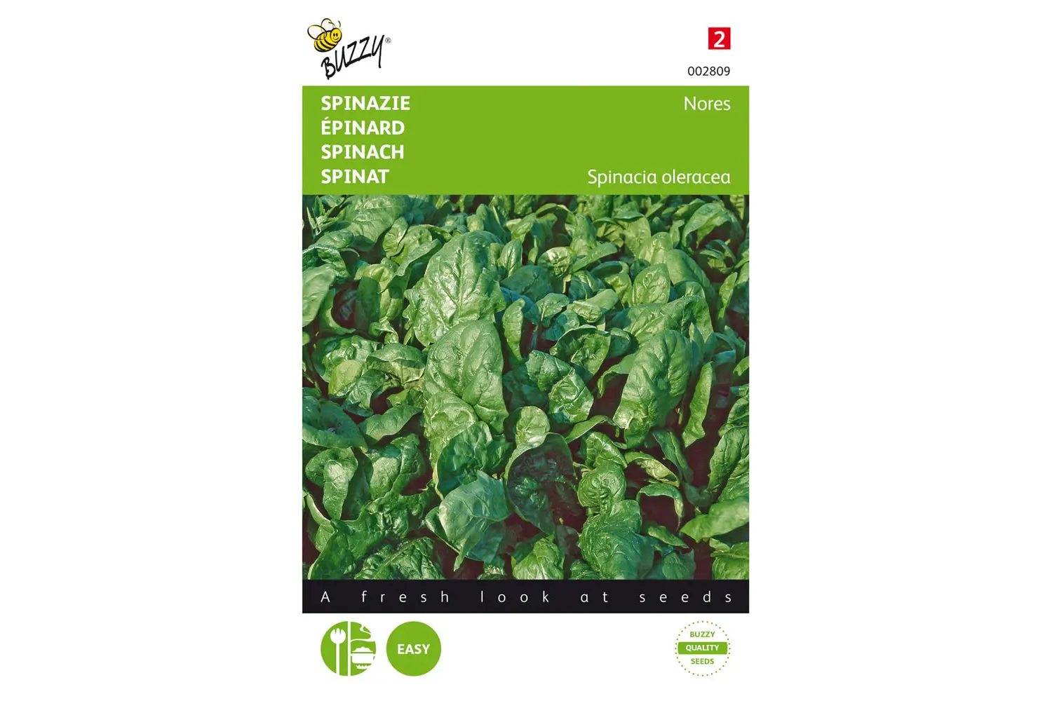 Spinat aus Buzzy Seeds (Spinacia oleracea) ist ein schnell wachsendes, einjähriges Blattgemüse, das früh im Frühling erhältlich ist. Es handelt sich um ein uraltes Gemüse, das erstmals in Persien angebaut wurde.