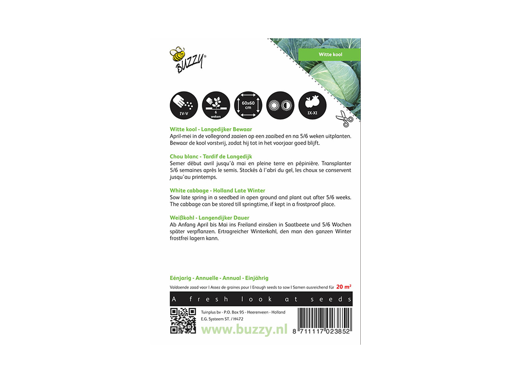 Säe die Samen dieses Weißkohls direkt im Garten von April bis Mai. Pflanzen Sie die jungen Kohlpflanzen im Juni mit einem Abstand von 70 x 60 cm aus. Achten Sie darauf, dass der Boden ausreichend feucht bleibt, aber vermeiden Sie eine Überdüngung. Zu viel Stickstoff kann eine schwarze, gebogene Kante im Kohl verursachen, die nur beim Schneiden sichtbar ist. Verhindern Sie also ein zu schnelles Wachstum durch übermäßige Befruchtung. Ernte den Kohl von September bis Dezember.