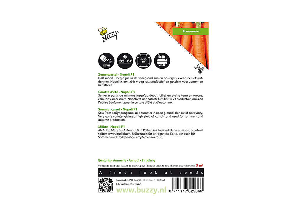 Napoli F1 ist der früheste und schönste Sommer-Karotten-Hybrid für Gärtner und Gemüsegarten-Amateure. Die Karotten sind leicht konisch geformt, wunderschön gefärbt und von gleichmäßiger Qualität. 'Napoli F1' ist eine sehr produktive Sorte und eignet sich sowohl für den Sommer- als auch für den Herbstanbau.