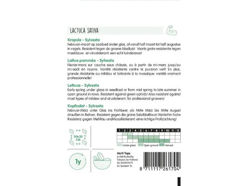 Kålsalat Mafalda kann von Februar bis März unter Glas ausgesät werden, von Mitte März bis Mitte August auf offenem Boden in Reihen. Die Sorte ist resistent gegen die grüne Blattlaus, gegen Mehltau und Virusresistenz: eine echte gartenbauliche Sorte!