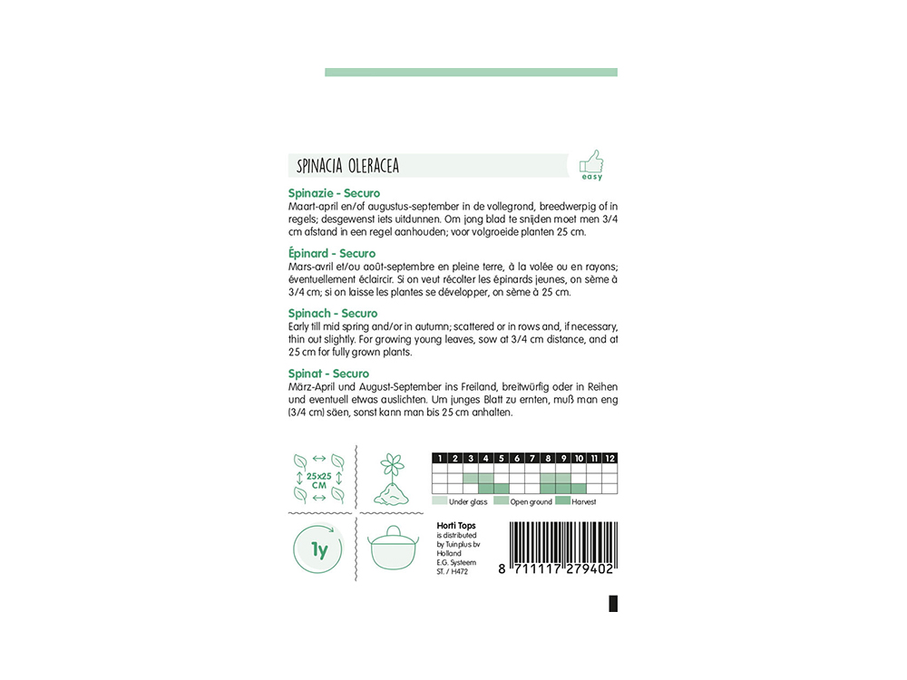 Das Spinat Securo Wolf Reisezelt A+B kann unter Glas gepflanzt werden, breit und recht dick, je nach Wetter. Sät in Reihen von Anfang März bis Ende April und von Ende Juli bis Ende August auf offenem Boden.