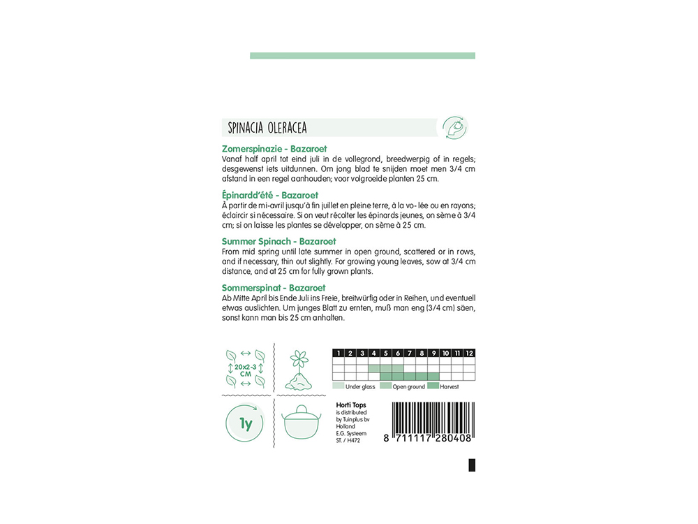 Sommerspinat-Bazarot ist sehr breitblättrig, dunkelgrün gefärbt und schimmelresistent. Aufgrund des Mangels männlicher Pflanzen (hermaphroditisch) kann sie länger geerntet werden.