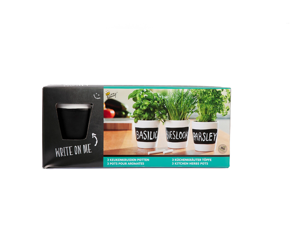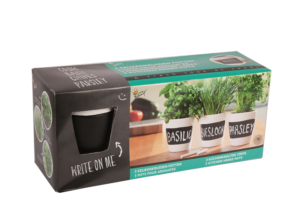 Drei wunderschön handfertigte Töpfe , die perfekt auf der Küchenarbeitsplatte oder im Fensterbrett aussehen. Die weißen Töpfe können immer wieder mit der bereitgestellten Kreide auf der vorgesehenen Fläche geschrieben werden.