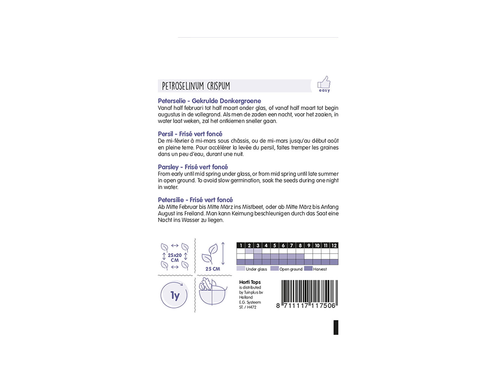 Petersilie unter Glas von Mitte Februar bis Mitte März oder von Mitte März bis Anfang August im Garten aussäen. Wenn du die Samen über Nacht vor dem Aussaat in Wasser einweichst, keimen sie schneller.