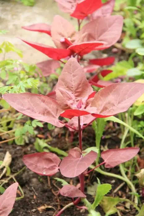 Atriplex hortensis forme une grande plante aux feuilles succulentes, vertes ou rouges, triangulaires, et de grandes grappes denses de petites fleurs, suivies de graines papier.