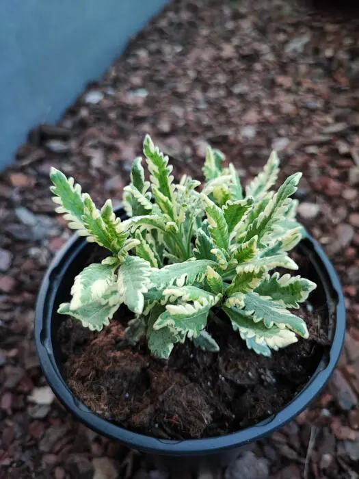 Lavandula x heterophylla (groupe Gaston Allard) 'Meerlo' est un arbuste lavande bien ramifié avec de belles feuilles panachées. Les feuilles gris-vert clair aux bords jaune crème sont aromatiques, linéaires et dentelées.