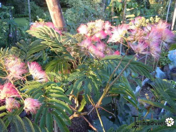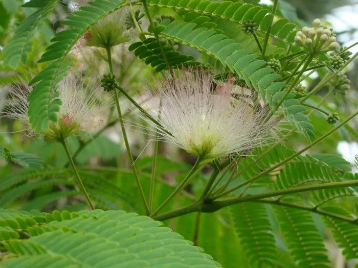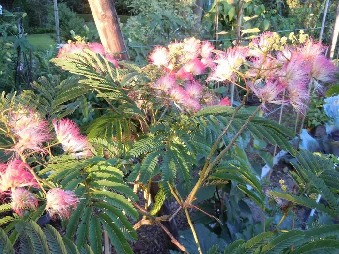 Albizia julibrissin var. Ernest wilson est un arbre à feuilles caduques à croissance rapide, avec une large couronne et de magnifiques feuilles plumeuses qui se referment la nuit.