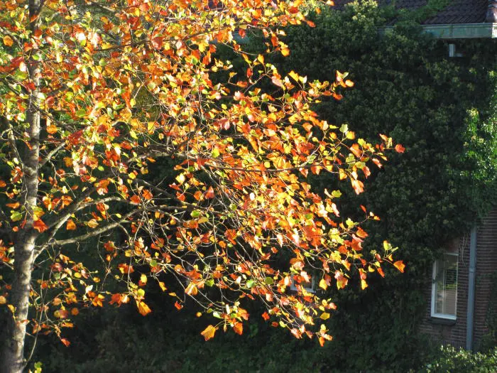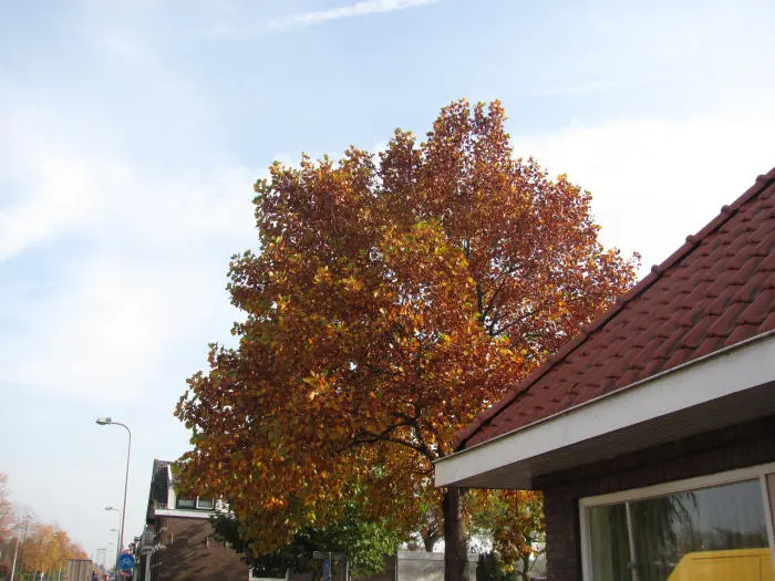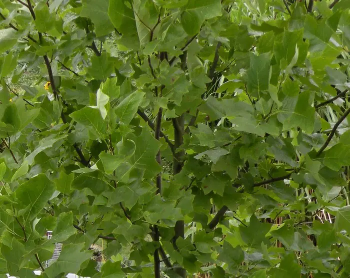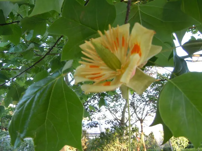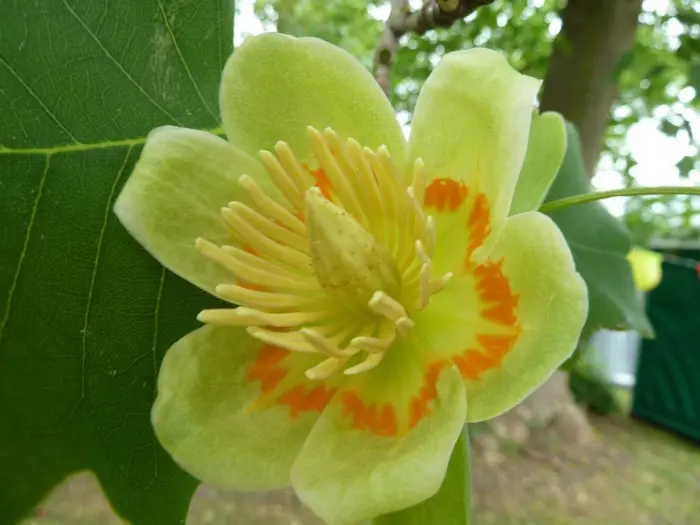 Liriodendron tulipifera fleurit de 6 à 8 ans. La fleur a la forme d’une tulipe, d’où son nom, mais la feuille a aussi une forme spéciale, on dirait qu’un morceau a été coupé.