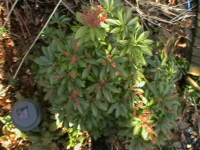 Elle possède un magnifique feuillage persistant, composé de longues feuilles brillantes, lancéolées et pointues, légèrement dentelées sur le bord. Les jeunes pousses sont de couleur rouge cuivré, puis les feuilles deviennent vert foncé.