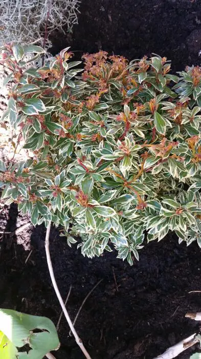 Elle possède un magnifique feuillage persistant, composé de longues feuilles brillantes, lancéolées et pointues, légèrement dentelées sur le bord. Les jeunes pousses sont cuivre-orangé, puis les feuilles deviennent vert foncé avec des bords blancs qui prennent à leur tour une teinte rose.