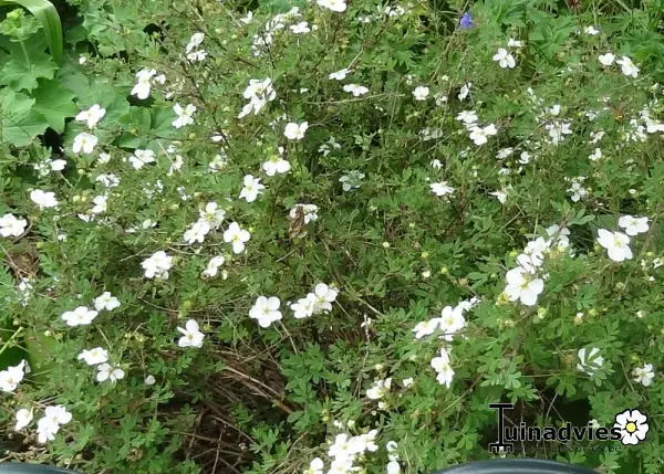 Potentilla fruticosa 'Abbotswood' est un petit arbuste dense et touffue aux feuilles gris-vert.